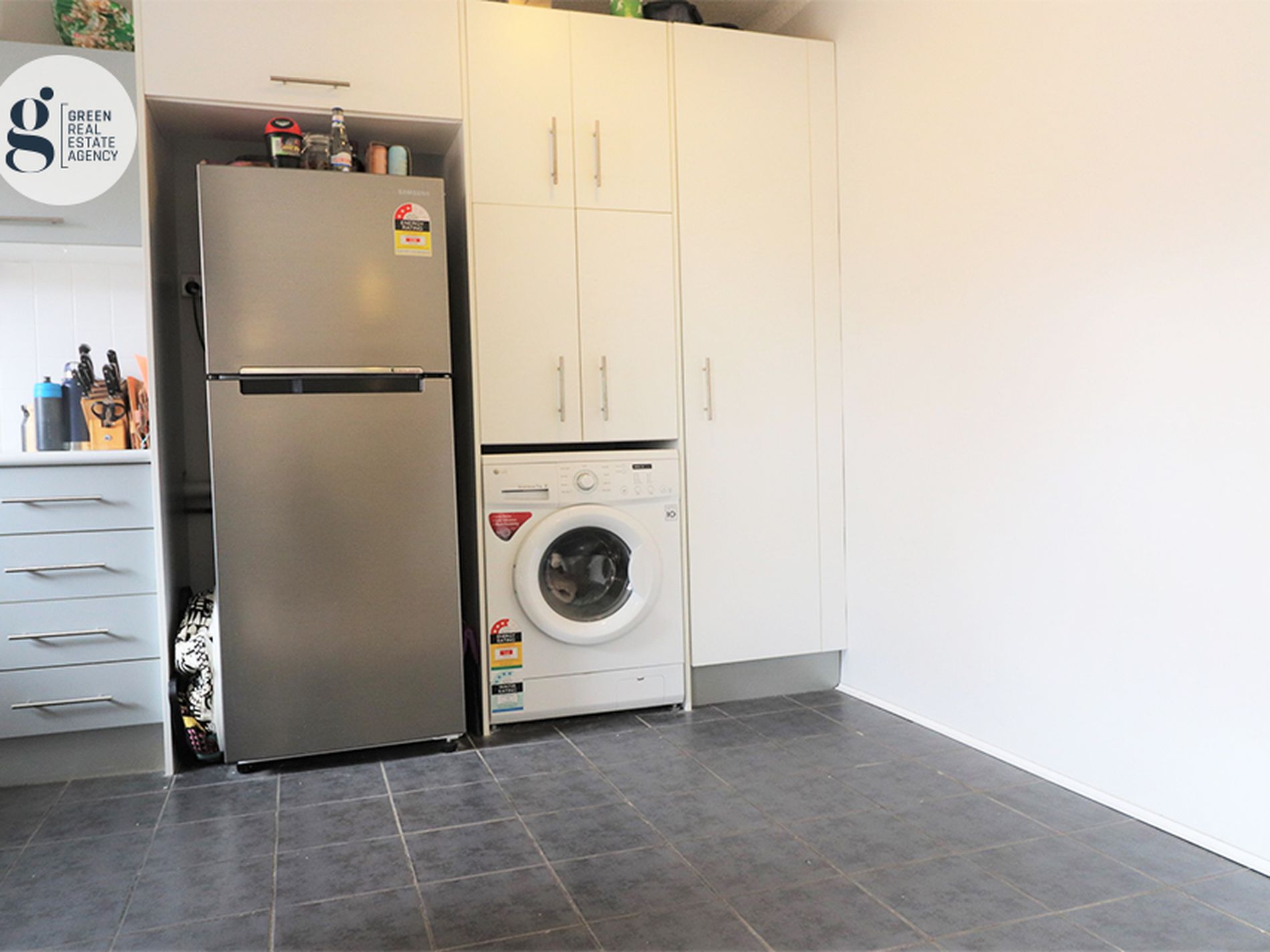 - Washing machine space conveniently located in the kitchen