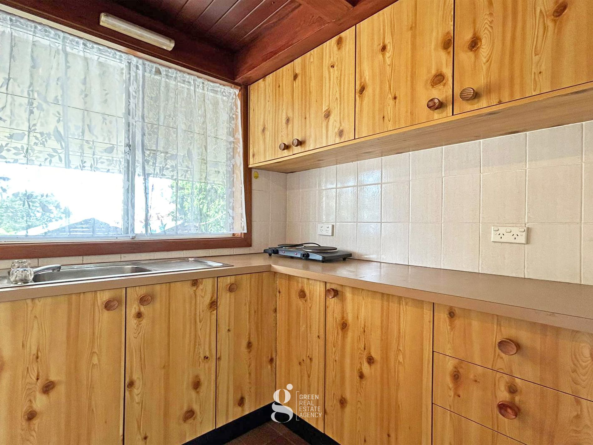 - Light-filled, practical kitchen with portable electric stove