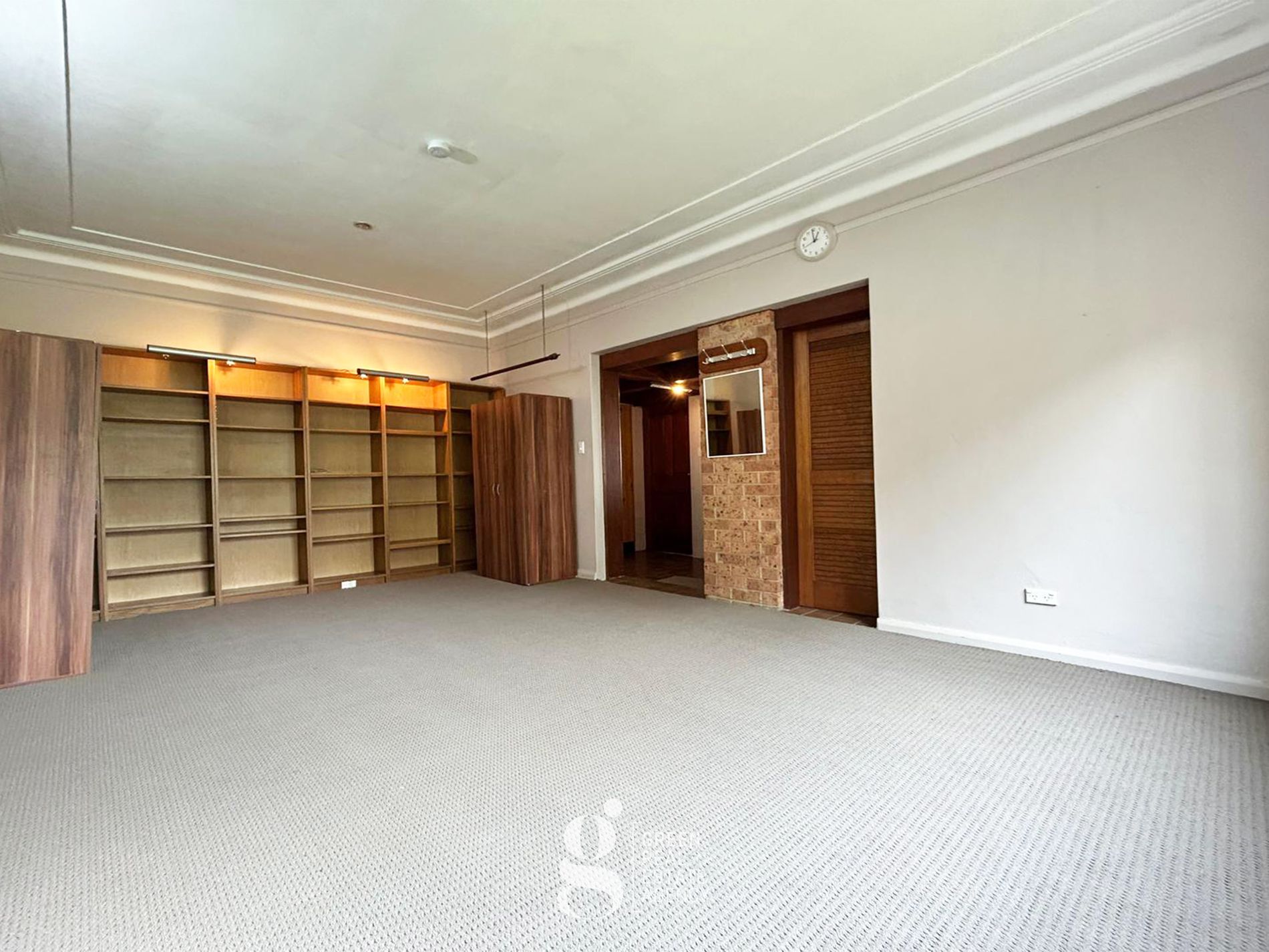 - Built-in wall-mounted shelves & cabinet providing ample storage space