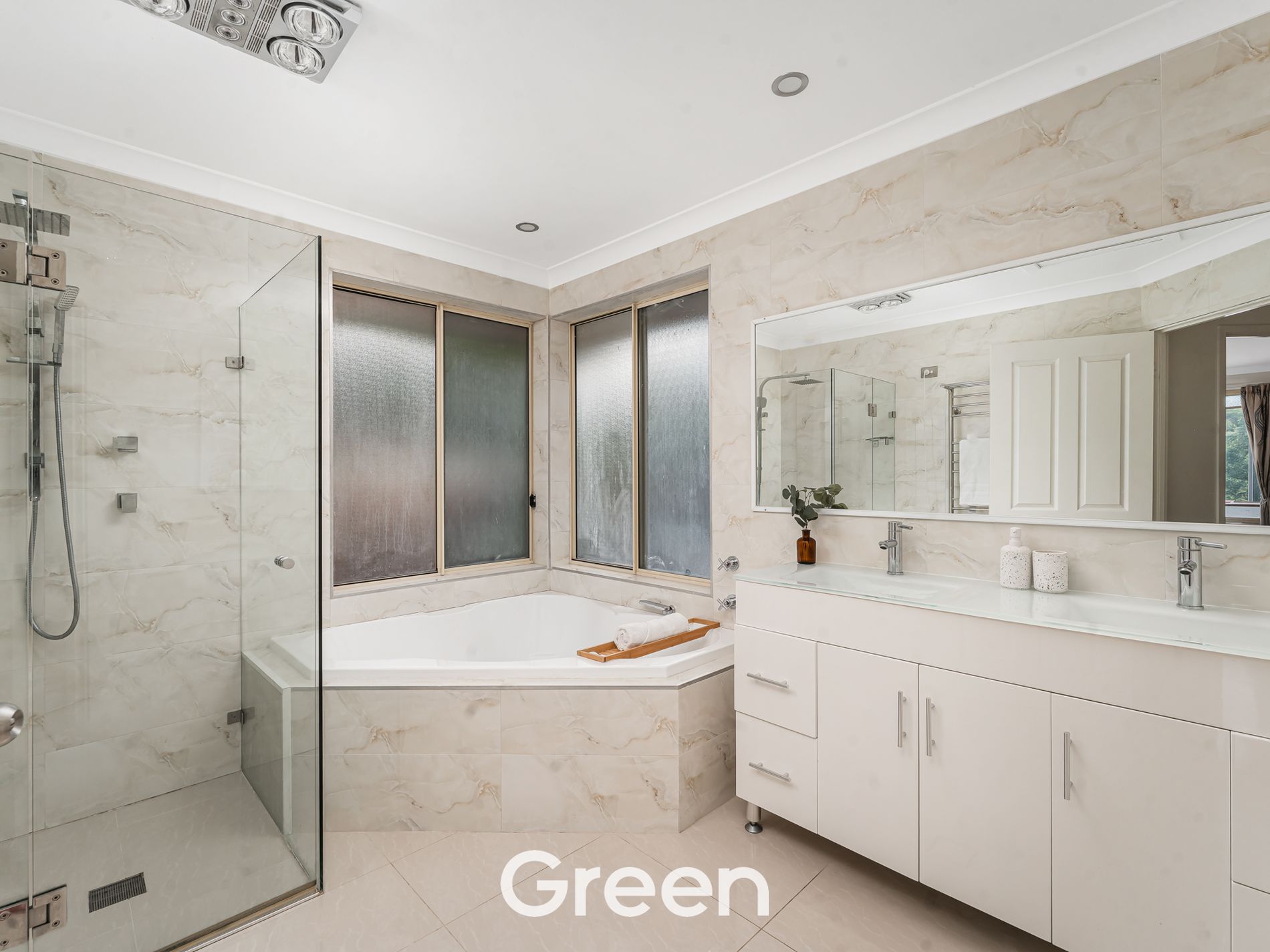 • Spacious bathroom with oversized corner bathtub