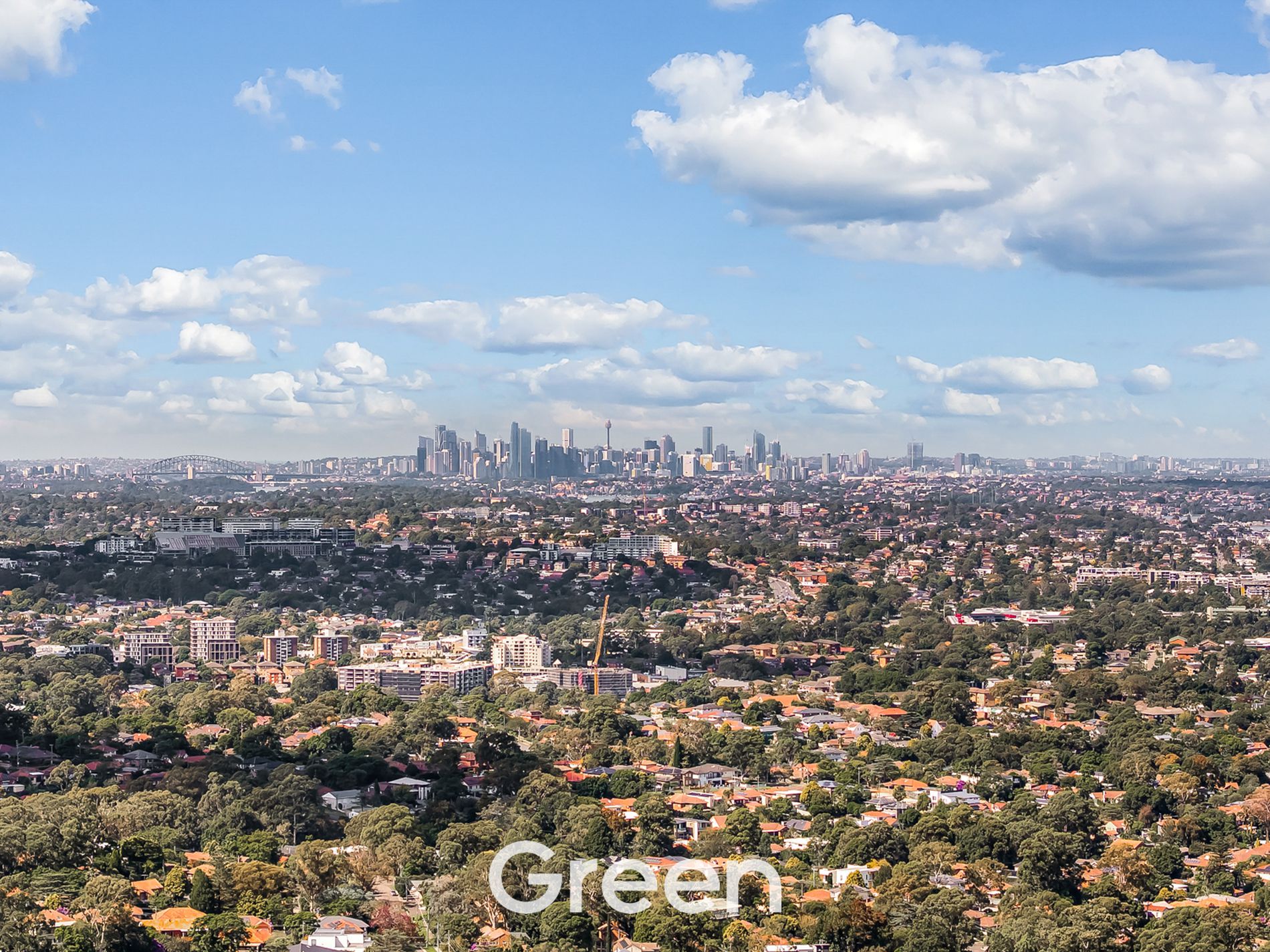 • Spacious living area with large window capturing expansive elevated views towards Rhodes, Olympic Park and Sydney CBD